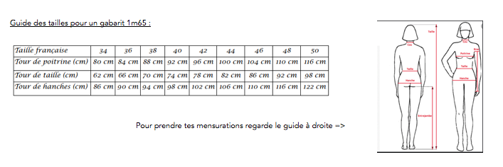 - De 1,50m (pour le 34) à 1m80 (pour le 50) ajoute environs 5cm par taille sur une laize de 1M40 du tissu de ton choix